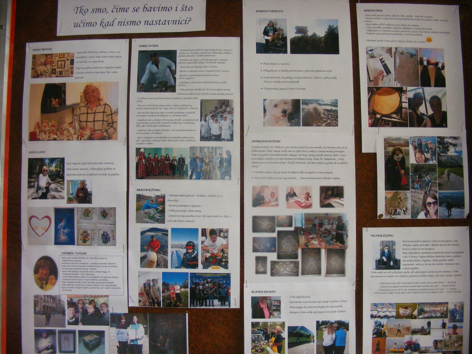 Zašto je cjeloživotno učenje važno, ove su nam godine odlučili pokazati naši nastavnici! Tko su u slobodno vrijeme, čime se bave kad nisu u razredu, što vole, o čemu uče, kako rade na sebi, što ih veseli i što im daje smisao otkrili su na panou u hodniku škole. Svoje su izjave popratili vlastitim fotografijama u „neškolskom“ izdanju i time oduševili svakoga tko se našao u blizini!