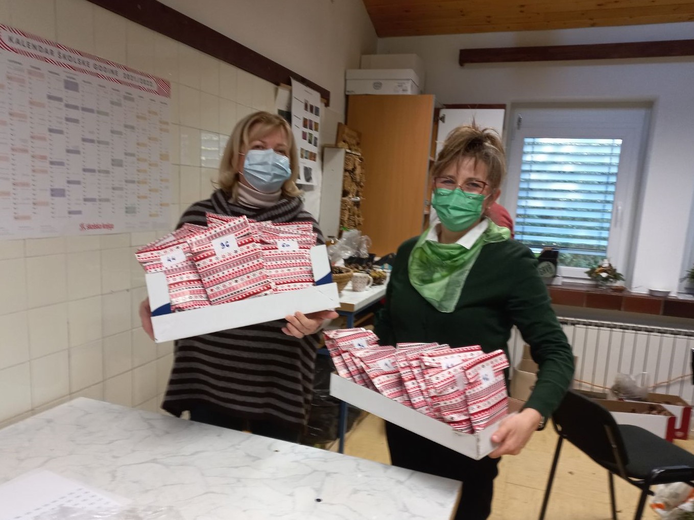 Proizvodi naše zadruge uz mali slatki zalogaj bili su upakirani u simpatičnim papirnatim vrećicama koje su također izrađene u zadruzi i podijeljene za vrijeme velikog odmora u holu škole. Budući da su prodani svi brojevi i svi su bili dobitni, u hodniku je vladao „šušur“ i uzbuđenje jer su učenici a i djelatnici koji su također sudjelovali, nestrpljivo iščekivali izvlačenje svojeg broja i znatiželjno zavirivali u svoje poklončiće. Da bi sve bilo zabavnije i veselije pobrinuo se naš Djedica Mraz Filip koji je svojim nastupom osigurao ulogu djedice za puno godina…. Ho ho hoooo… Želimo vam sretan Božić i sretnu Novu 2022.godinu.